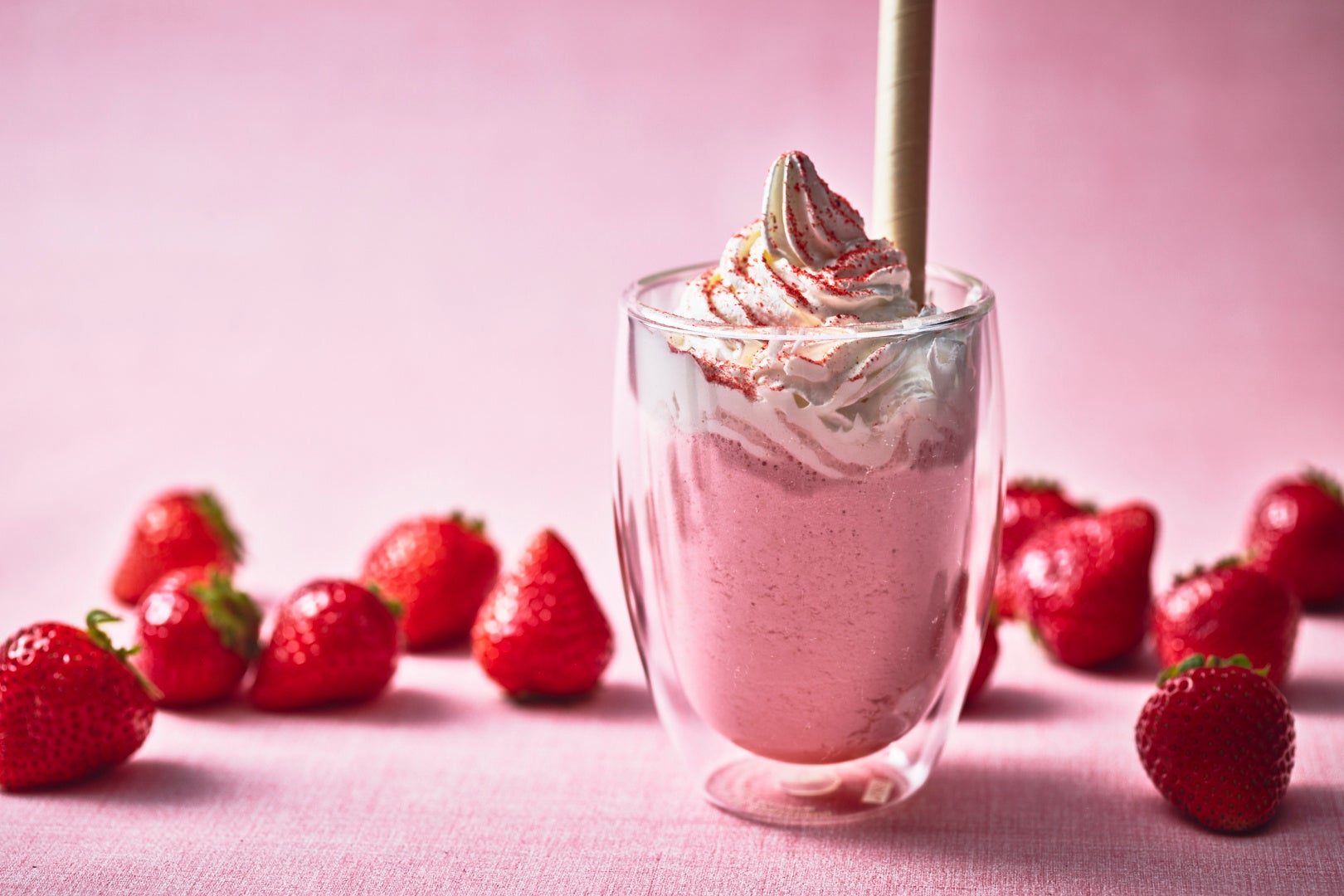 ストロベリーアフタヌーンティーご注文のお客様限定で、ストロベリーラテとスムージーも追加でお愉しみいただけます。口に含んだ瞬間、甘酸っぱいいちごの香りと生クリームの豊かな味わいに包まれる、とびっきりのいちごタイムを満喫していただけます。渋谷の絶景を望むテラスで味わうひとときもおすすめ。