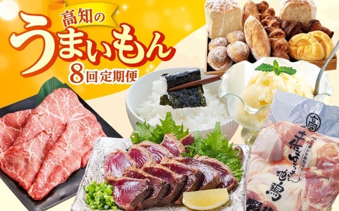 高知市の選りすぐりの返礼品を集めた贅沢定期便です。 高知市の「うまいもん」を2月から9月までご堪能いただけます。土佐和牛の中でもさらに上質なよさこい和牛に、自然豊かな地で育ったはちきん地鶏、高知が誇る「カツオのたたき」を2種。