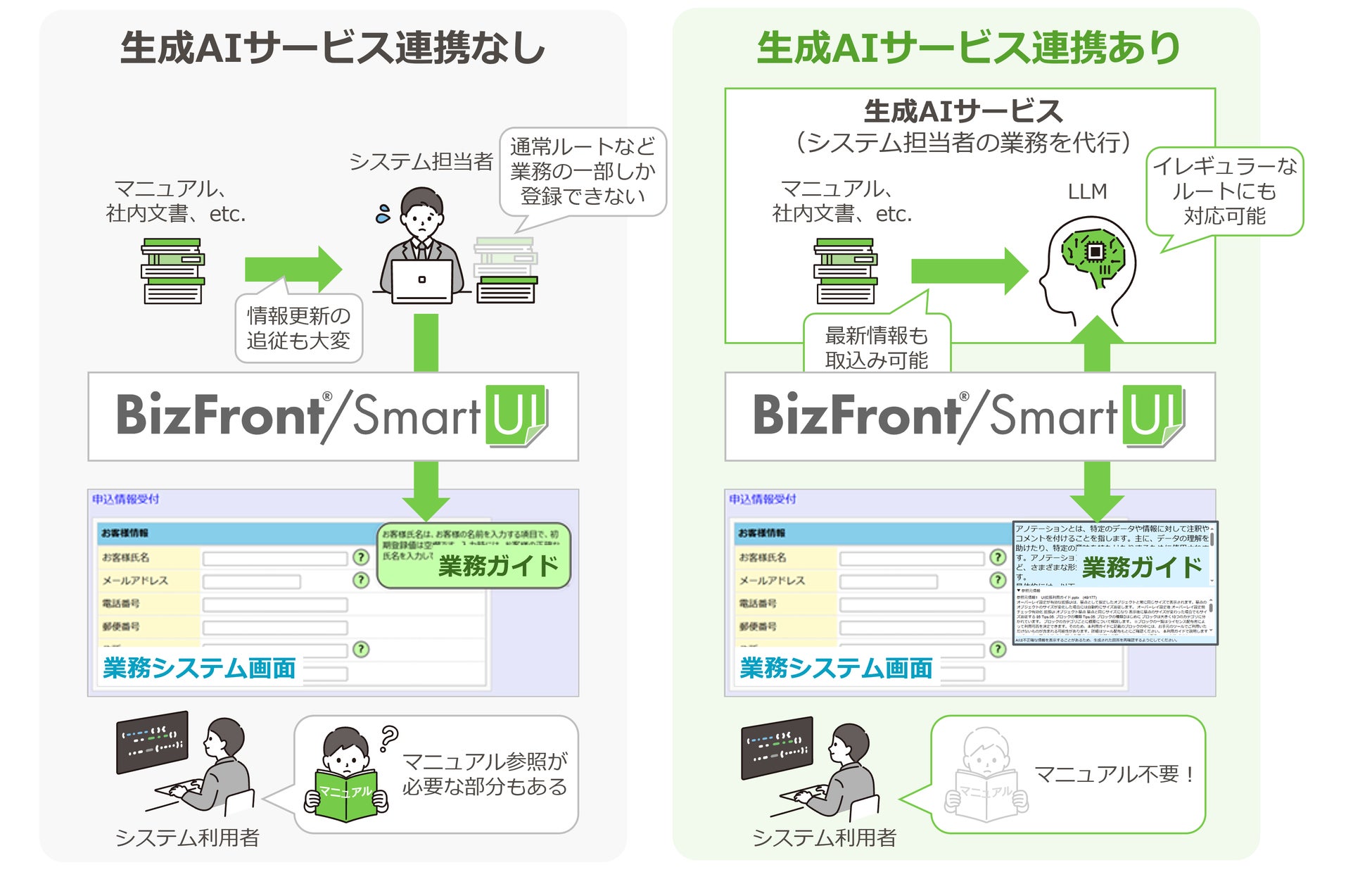 業務システムの利用定着を支援する「BizFront/SmartUI」と企業向け生成AIサービスとの連携により業務負担を軽減