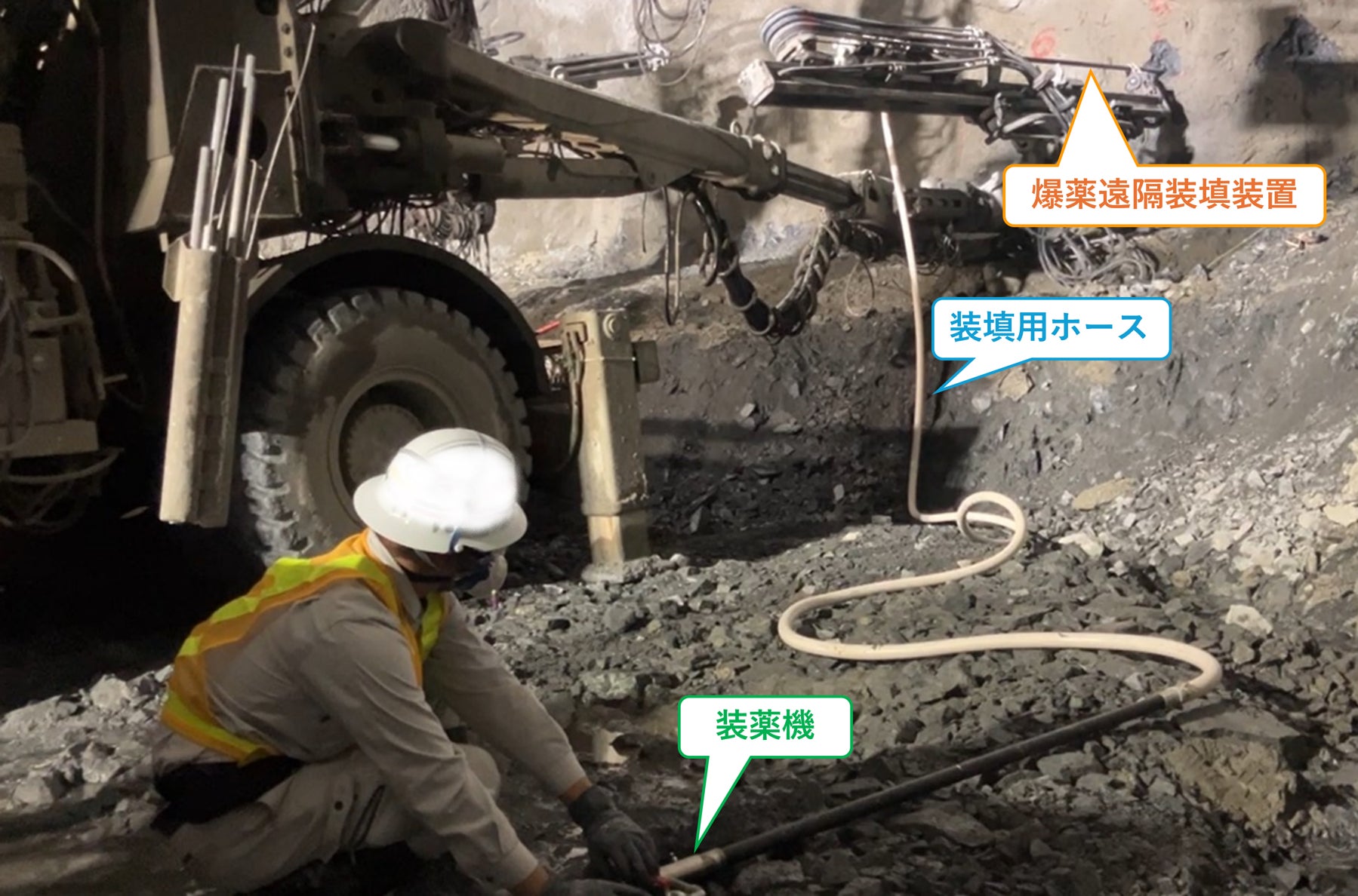 本装置とドリルジャンボ付近に設置した装薬機を、市販の非耐電式耐圧ホース(装填用ホース)で接続して爆薬を遠隔で装填するシステムを構築しました。