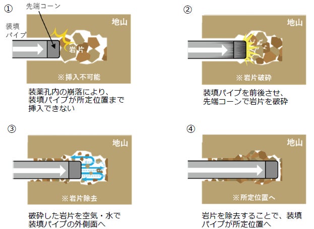 静電気による誘爆リスクを排除するため、「装填パイプ」はカーボンファイバーを主体とする非鉄製に、「先端コーン」はステンレス製にしました。また、装薬孔内に岩片が崩落して装填パイプを所定位置に挿入できない場合は、先端コーンで岩片を破砕し、空気や水で装填パイプ外側面へ押し出して除去します。