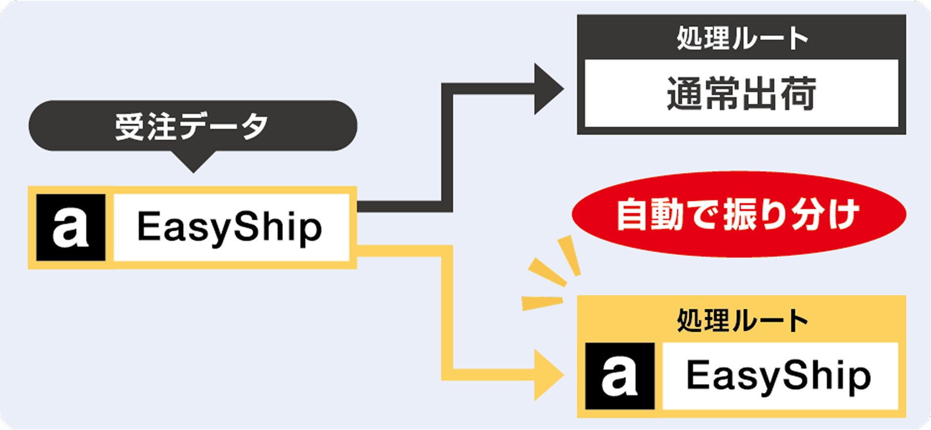 受注データを元に、通常出荷注文と「Amazon Easy Ship」注文を自動で判別し、それぞれの処理ルート※に振り分けることができるため、手作業による仕分けが不要になり、出荷業務の効率が向上します。