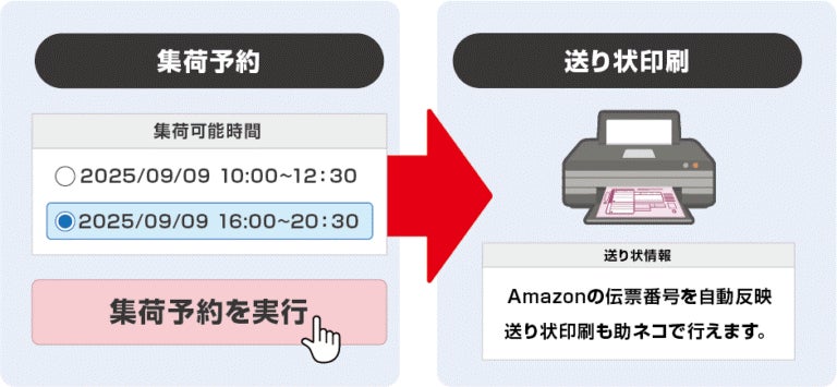 「集荷予約を実行」ボタンを押すだけで集荷予約が完了し、その後送り状も印刷できるため、助ネコの管理画面からワンストップで発送準備を完了できます。