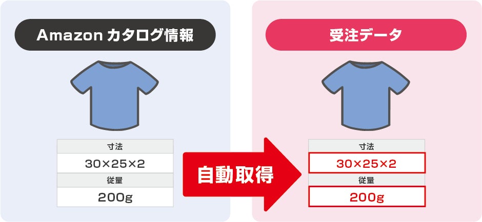 受注データ取込時、Amazonのカタログ情報から商品の寸法(幅×奥行×高さ)と重量情報を自動で取得します。自動取得により、集荷依頼時の情報入力が不要となり、手動入力の手間を省けます。