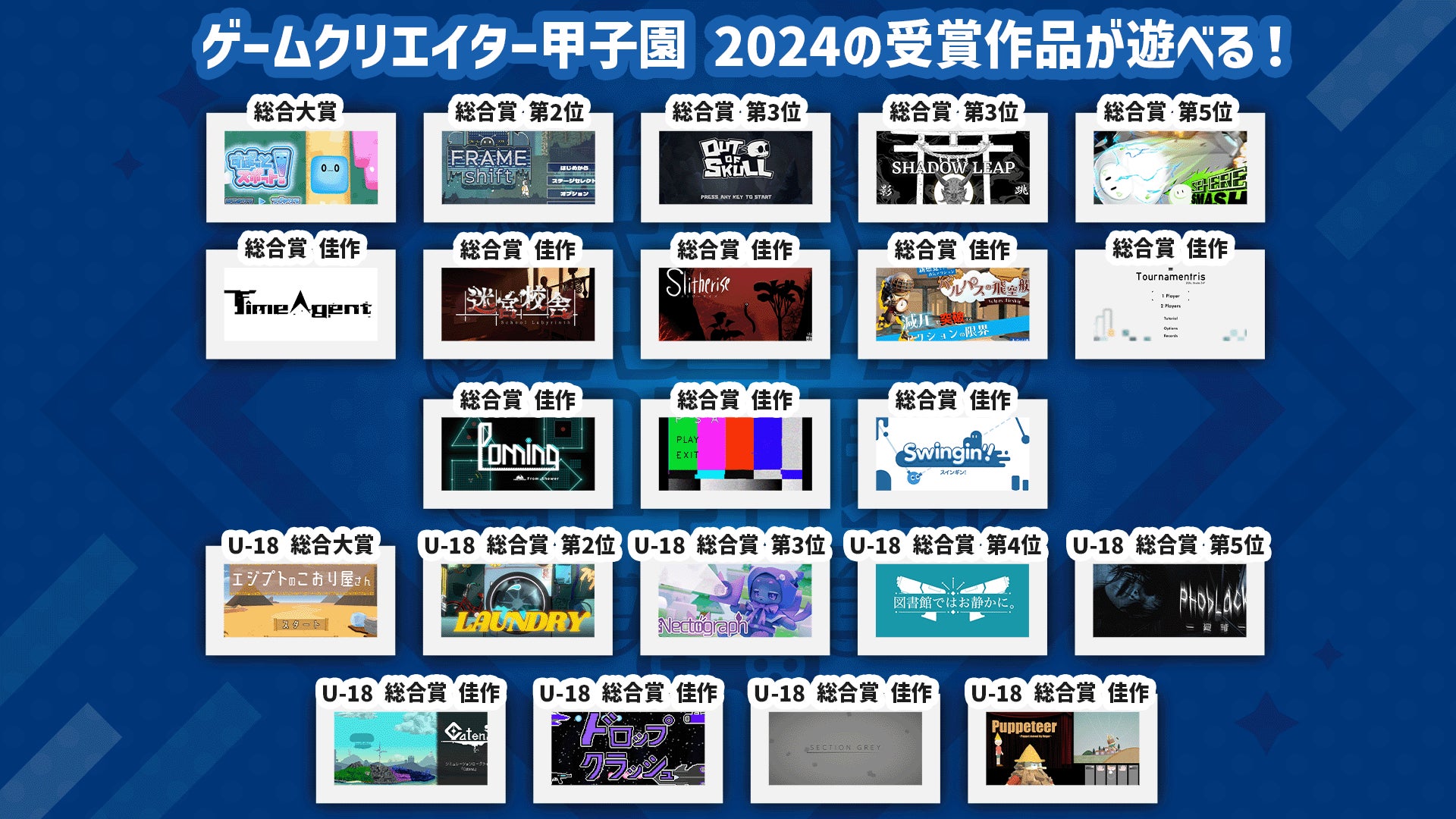 「東京ゲームダンジョン7」のゲームクリエイターズギルドブース(Z-4)では、『ゲームクリエイター甲子園 2024』の1001作品の応募作の中から総合大賞を受賞した「すぽっとスポット!」や、U-18総合大賞受賞作品などファイナリストである22作品を展示します。