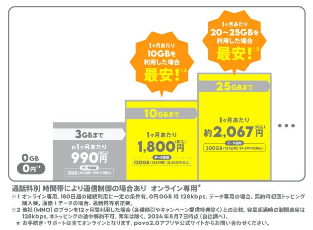 (注3)国内MNOが現在受付中の20~25GBプラン(割引前基本料)の12カ月間相当で比較。2024年8月14日現在、当社調べ。