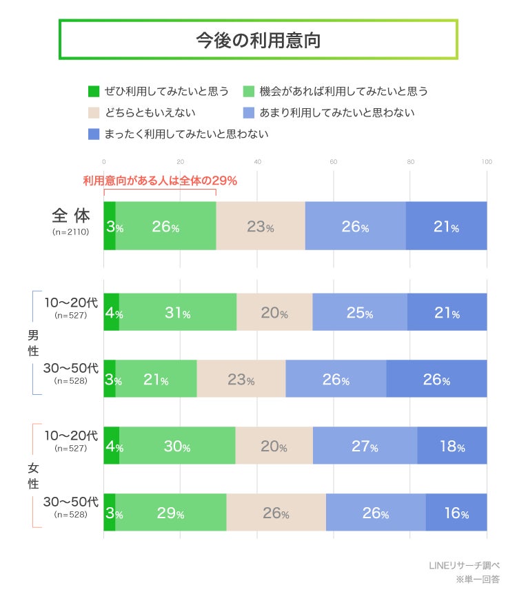 次に、今後の利用の意向について回答してもらったところ、利用意向がある人の割合(「ぜひ利用してみたいと思う」「機会があれば利用してみたいと思う」の合計)は全体で29%となりました。