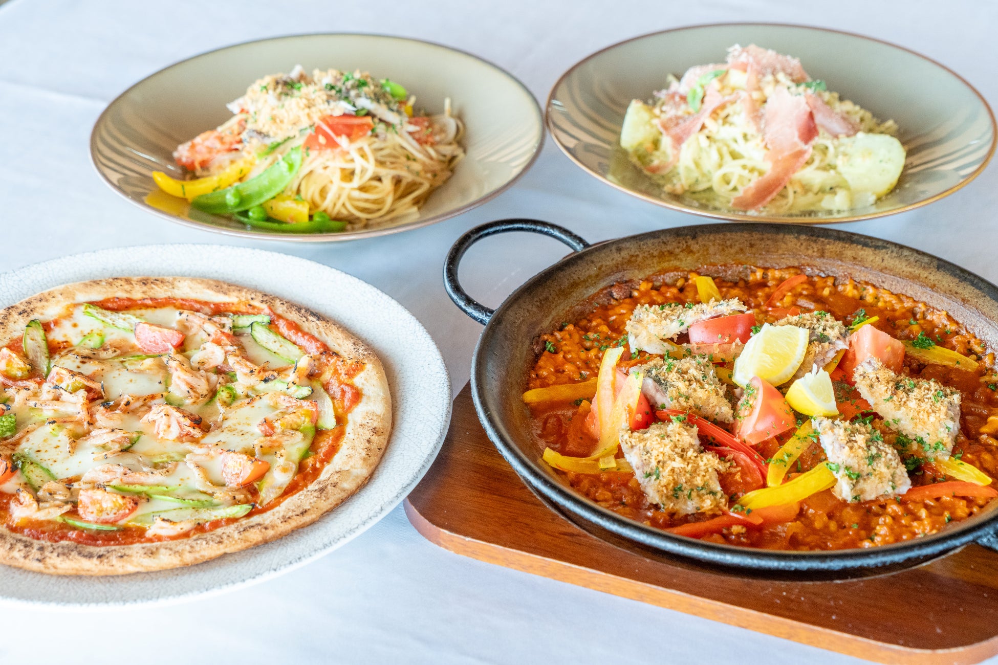 人気のパエリアをはじめ、季節のパスタやピザ、さらに前菜やデザートまで充実のラインナップでご用意。