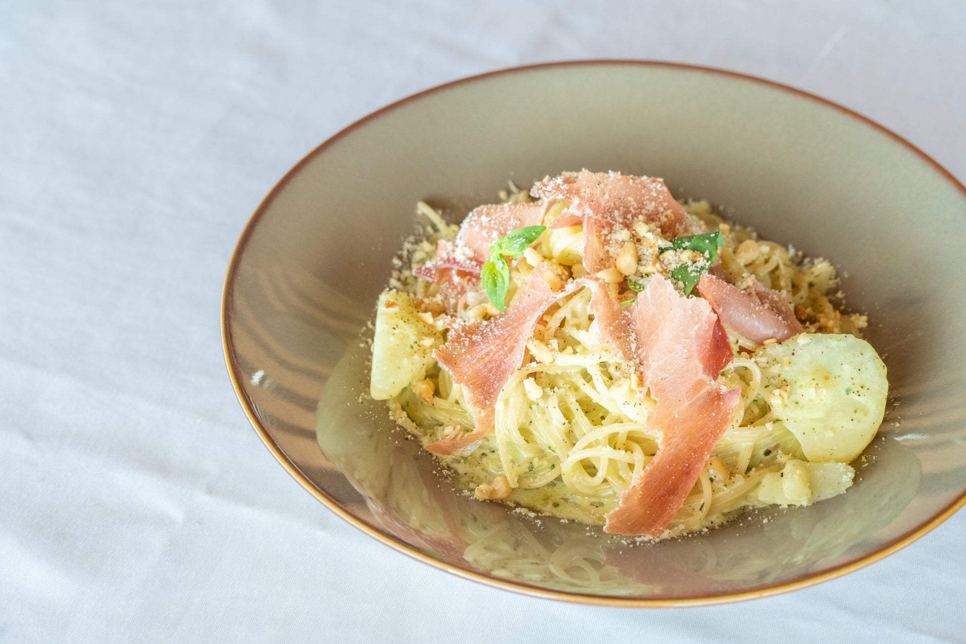 初夏の香りをまとったバジルクリームソースに、ホクホクの新じゃが芋と芳醇な生ハムが絶妙に絡みます。