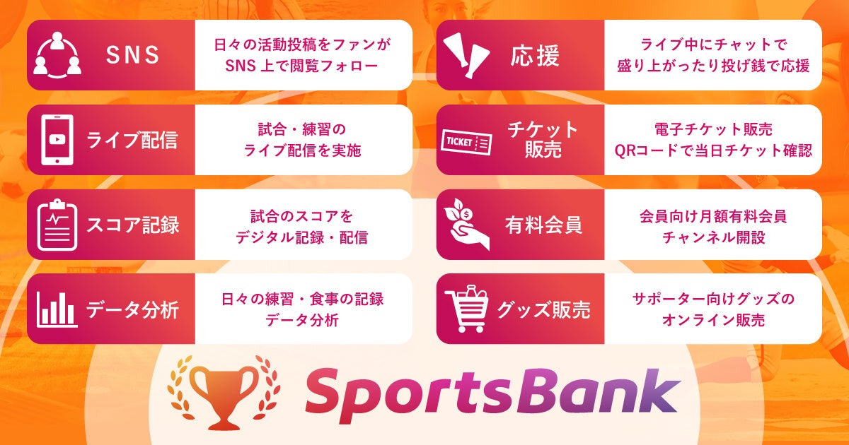 情報発信やライブ配信といったSNS機能に始まり、試合やトレーニングに特化したスコア記録やヘルスケア機能、新たな収益を生み出すファンクラブ機能、チケット販売機能などスポーツライフを支える多種多様な機能を通じてスポーツに関わるすべての人々を応援します!