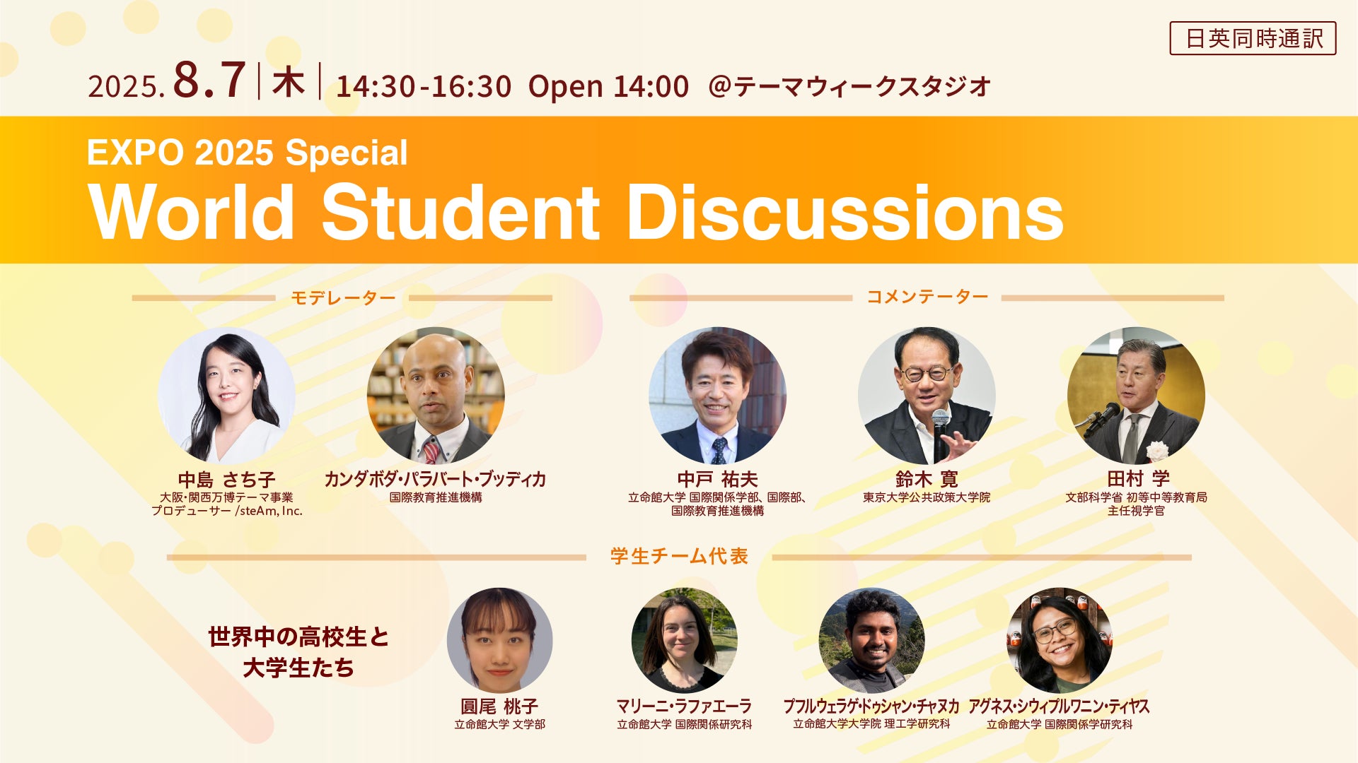 立命館大学と日本福祉大学が中心となって毎年行っている ”World Youth Meeting”を、2025年は一部万博会場で拡張型にてプロデューサー協働で、若者たちが世界の平和や人権、地球の未来について考える場 EXPO 2025 Special“World Student Discussions” として行います。アジア 、北米 、中南米、欧州、中東、アフリカ各国の大学生と高校生が参加し、SDGsや教育、人権、平和といったテーマで、英語の発表、議論、国際交流を目的としたイベントを実施します。