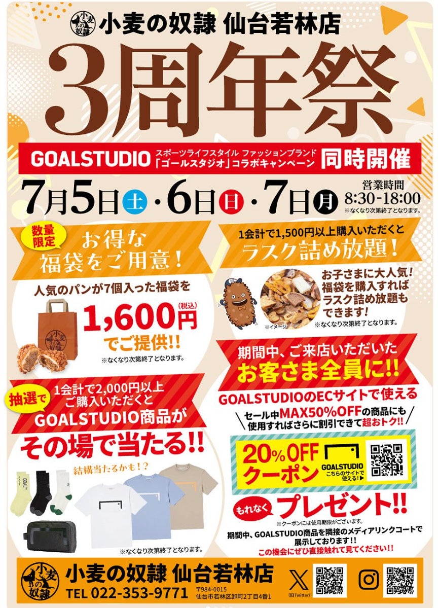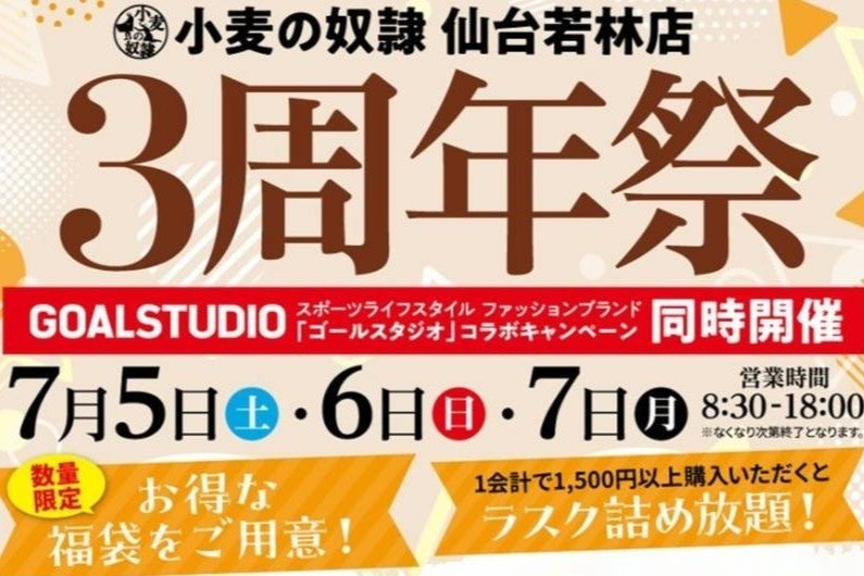 宮城県仙台市若林区にある【小麦の奴隷 仙台若林店】は、このたび3周年を迎えます。これまで支えてくださった多くのお客様への感謝を込めて、2025年7月5日(土)から7日(月)の3日間にわたり「3周年感謝祭」を開催いたします。