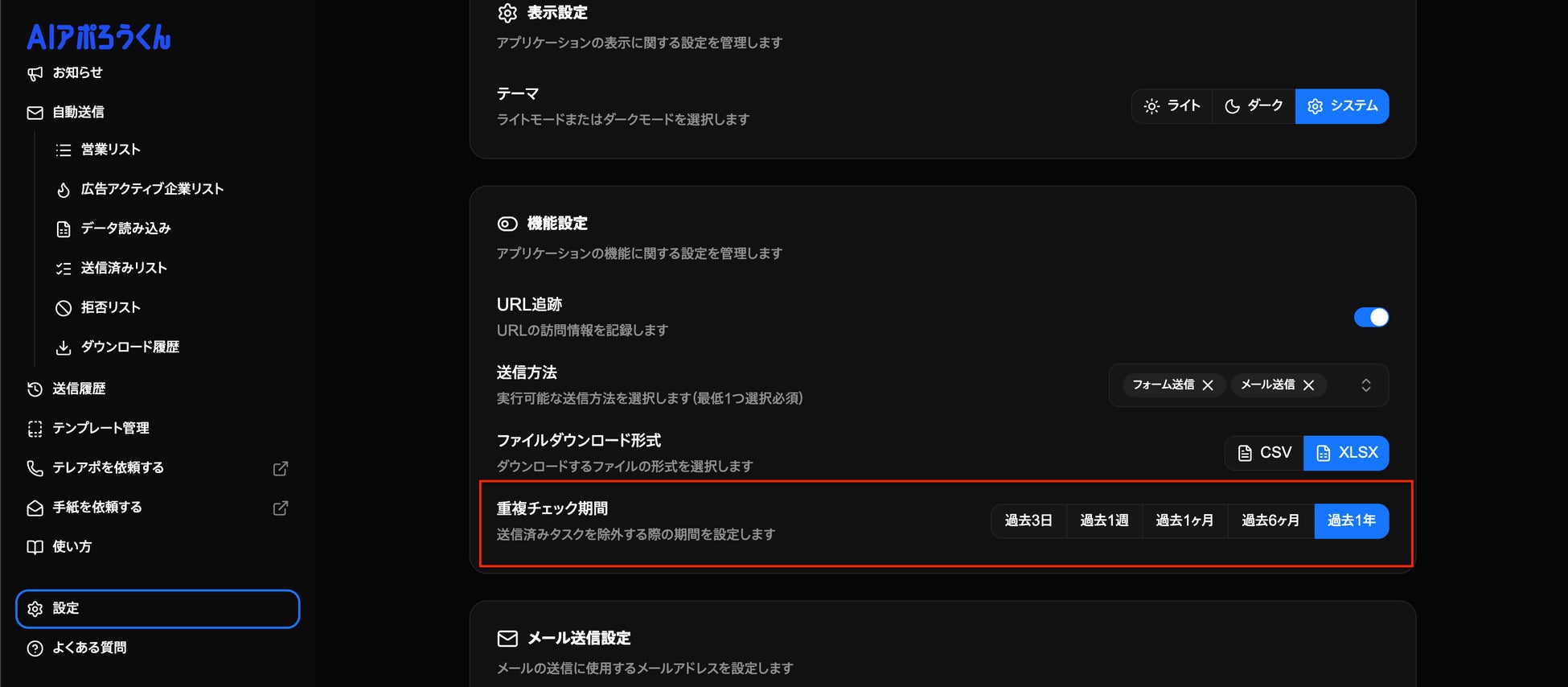 「AIアポろう」の管理画面にて、送信済み企業に対する次回の送信許可までの期間を、日単位・月単位で柔軟に設定できるようになりました。