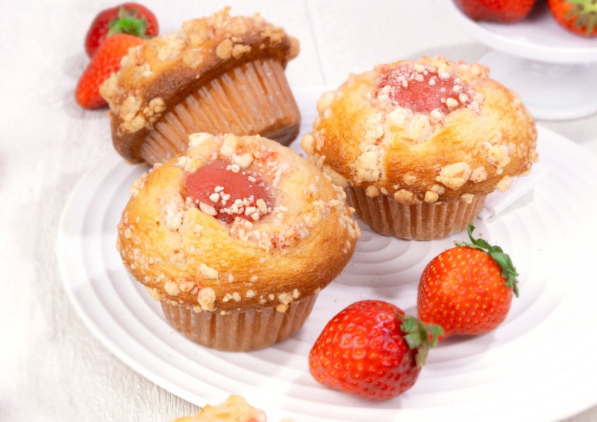 福岡県産のあまおう苺のフリーズドライパウダーとつぶつぶ果肉入りクリームをつめこんだ、苺の甘酸っぱさが美味しい、みずみずしく爽やかな香りのアミュプラザ博多店限定マフィンです。
