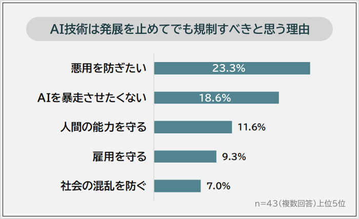 発展を止めてでも規制すべきと思う43人に理由を聞いたところ、1位は「悪用を防ぎたい(23.3%)」でした。2位「AIを暴走させたくない(18.6%)」、3位「人間の能力を守る(11.6%)」が続きます。