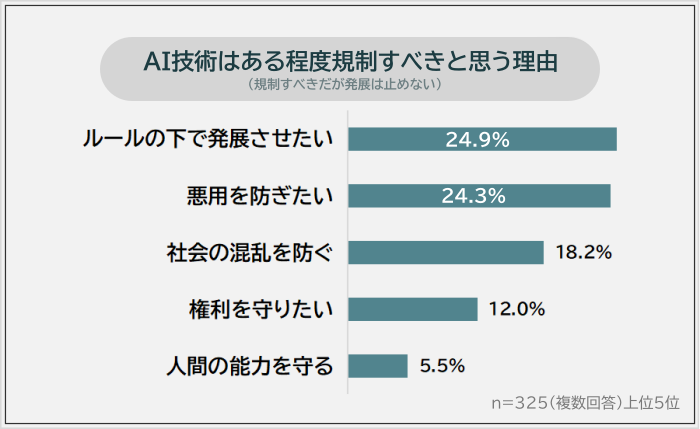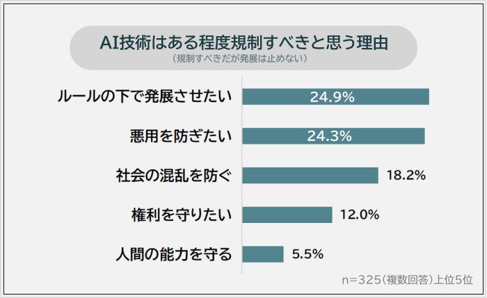 ある程度規制すべき(規制すべきだが発展は止めない)と思う325人に理由を聞いたところ、1位は「ルールの下で発展させたい(24.9%)」でした。僅差で2位「悪用を防ぎたい(24.3%)」が続きます。