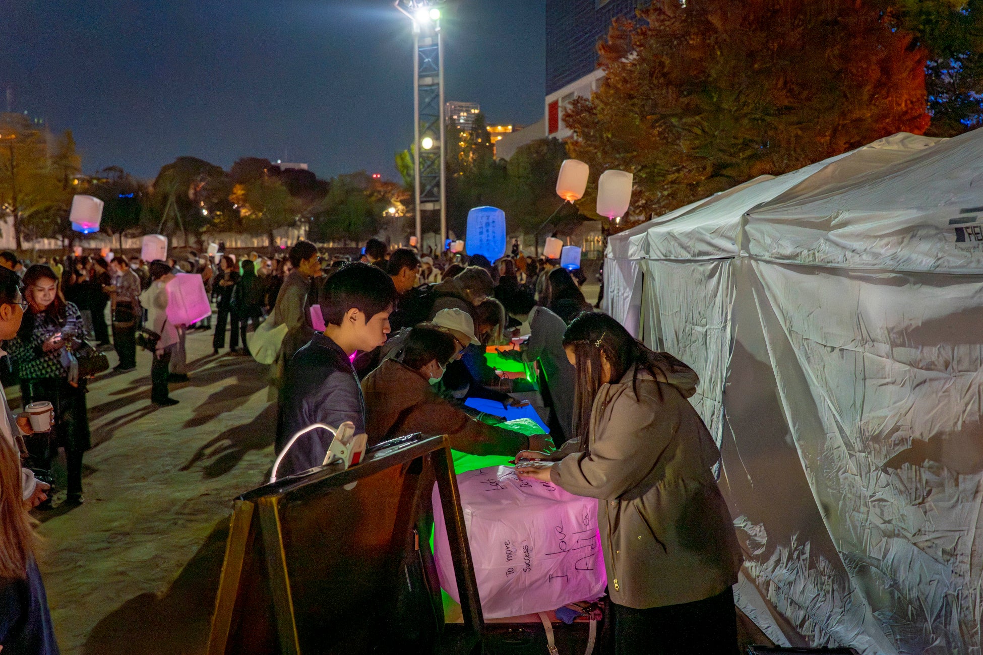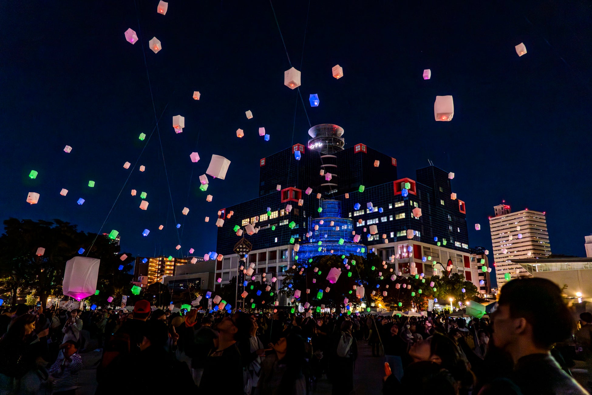 願いを込めた約500基のカラフルなランタンが一斉に夜空へ舞い上がると、澄み渡る秋の空は光の海へと変わりました。赤、青、緑色、そして柔らかなオレンジの光が重なり合い、まるで星空が地上に降りてきたかのような幻想的な光景に、会場からは歓声と拍手が響き渡りました。ランタン一つひとつに込められた願いが夜空に溶け込み、見守る人々の心に深い感動を刻む瞬間となりました。