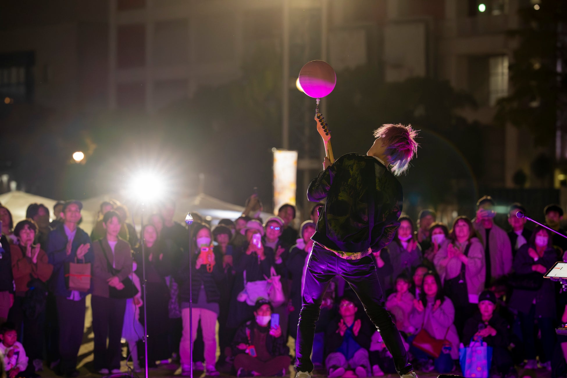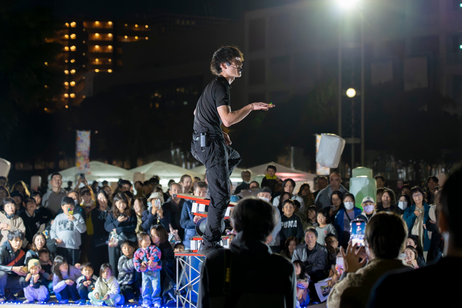 夜が訪れると、フリースタイラーNARIさんと、パフォーマーTAKAYAさんによる圧巻のパフォーマンスショーがスタート。華麗な技と音楽が融合したステージに、観客からは大きな歓声が上がりました。