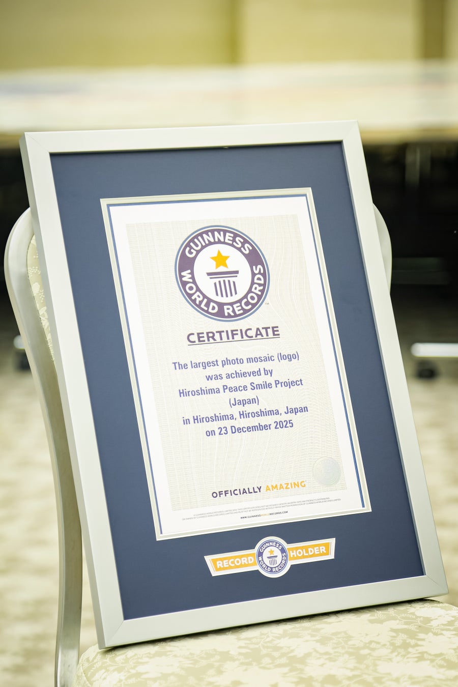 テレビ新広島(TSS)が主催する 「ひろしまピーススマイルプロジェクト」 の一環として、株式会社エスエーホールディングス(本社:広島県呉市、代表取締役:相川真太郎)傘下のグループ会社で、フォトスタジオを展開する株式会社スタジオアイ(本社、代表取締役:同)が制作の総合監修を務めた「ひろしまピーススマイルプロジェクト」の巨大モザイクアートが、2025年12月23日に達成したギネス世界記録™「Largest photo mosaic (logo)(写真で作られた最大のモザイク(ロゴ))」の公式認定証が、このたび正式に事務局より届きましたことをお知らせいたします。