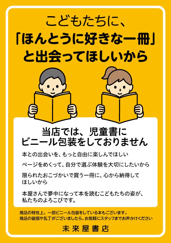株式会社未来屋書店(本社:千葉県千葉市、代表取締役社長:平川雅隆)は、2025年10月1日より全国の未来屋書店205店舗において、児童書へのシュリンクパック(ビニール包装)を全面的に廃止いたしました。