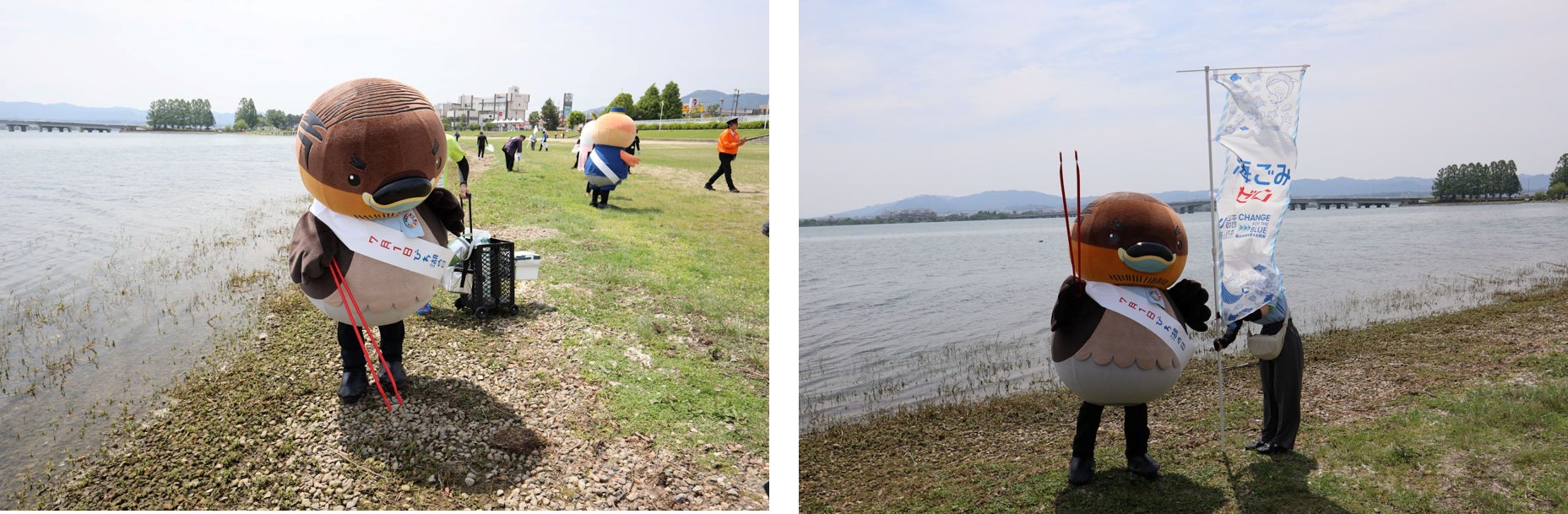 イベントには、企画に賛同する企業や団体、地域の方などたくさんの方々が参加。開催日が延期となったにも関わらず約245人の方が参加してくださり、今年も「海ごみPR大使」に任命された野洲のおっさんカイツブリと一緒にびわ湖の湖岸清掃を行いました。