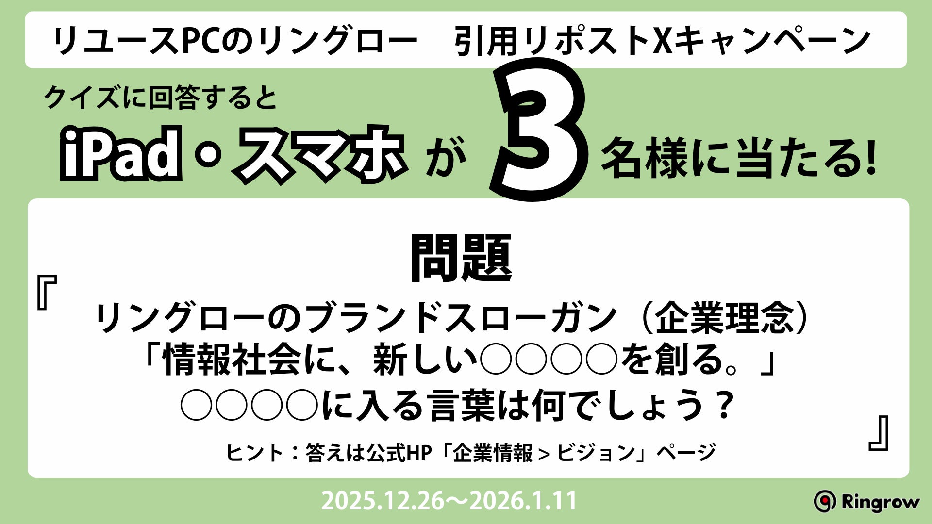 リユースPC事業を展開するリングロー株式会社(本社:東京都豊島区、代表取締役:碇敏之)は、公式X(旧Twitter)にて、クイズに引用リポストで回答すると、リユース品のiPadなどが当たるキャンペーン「引用リポストでクイズに答えてiPad(リユース品)がもらえるキャンペーン!!」を、2025年12月26日(金)から2026年1月11日(日)まで開催します。