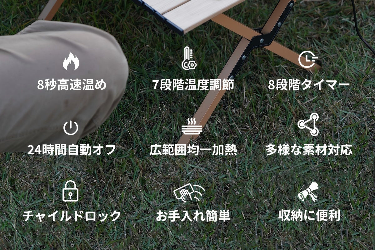 電源を入れてから、実用的な保温温度(約60℃)に到達するまで、わずか約8秒。キャンプで料理が冷めてしまった時、家庭で急いで朝食を温めたい時でも、「温まるのを待つ」というストレスから解放されます。