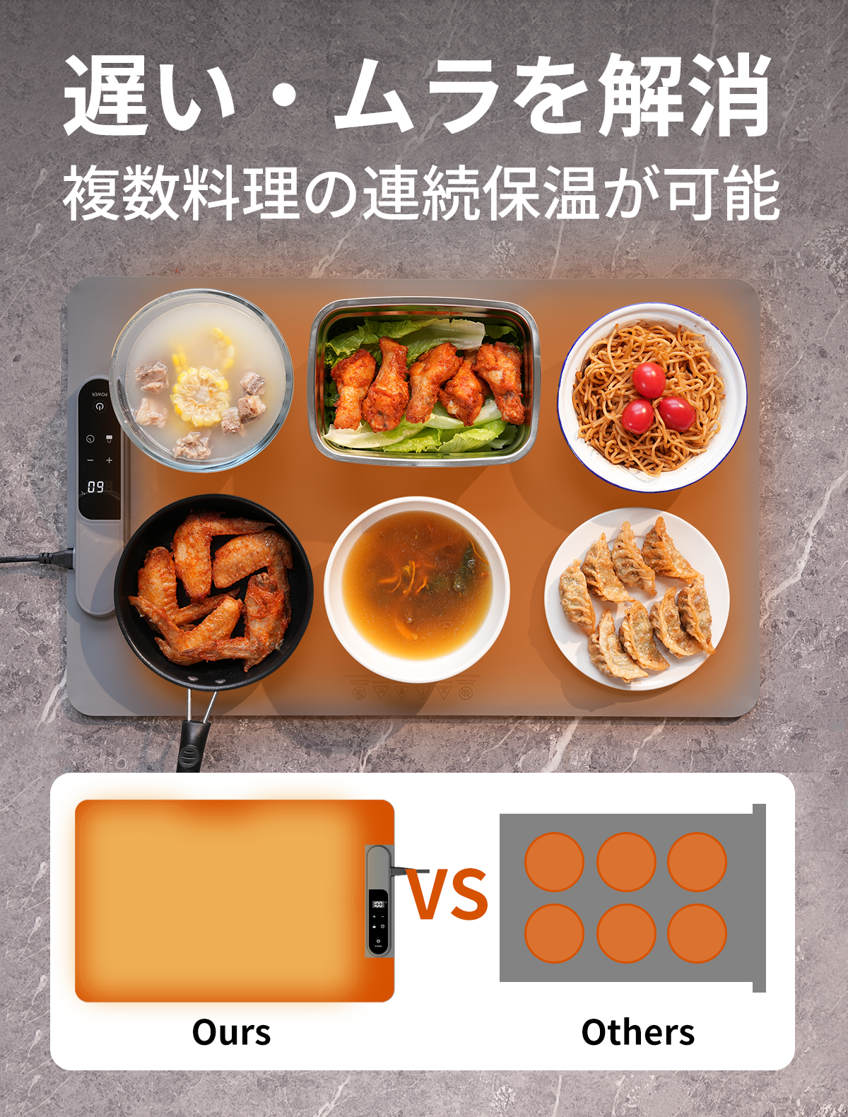 従来品のよくある局部加熱とは異なり、マット全体が約8秒で同時に、均一に発熱。大きいお皿やフライパン全体を載せても、端々まで同じ加熱効率を実現し、食材の「一部分だけ冷たい」という失敗をなくします。