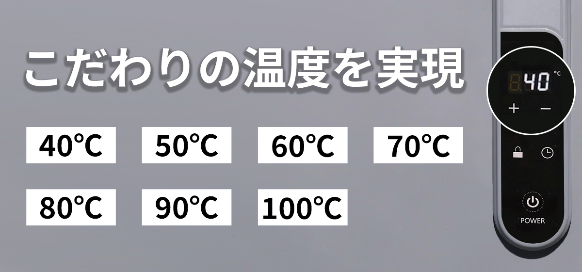 40℃の低温保温から100℃のしっかり加熱まで、7段階で細かく温度を選択可能。