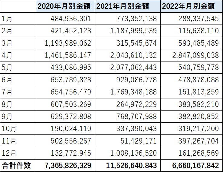 2020年から2022年まで、4月が落札件数に比例して高い金額となっていますが、2021年は4月よりも5月が最も高い落札金額となっていました。また、2021年は7月にも10億を超えたおよそ17億6,935万円となっていました。一方2022年7月はおよそ1億5181万円と年内で2番目に低い金額であり、各年の月別落札金額の推移がどれも異なった動きとなっています。
