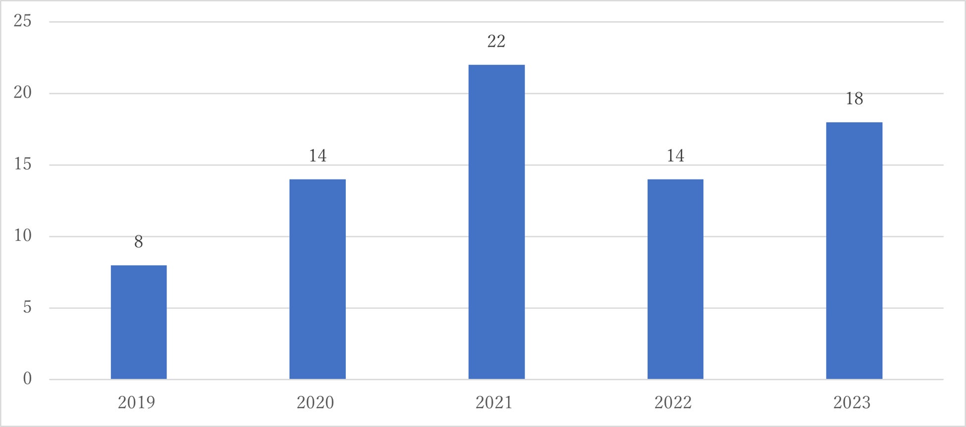 図14 2019年から2023年までの「子育て支援」を含む「助成金・補助金」の年間公告件数推移