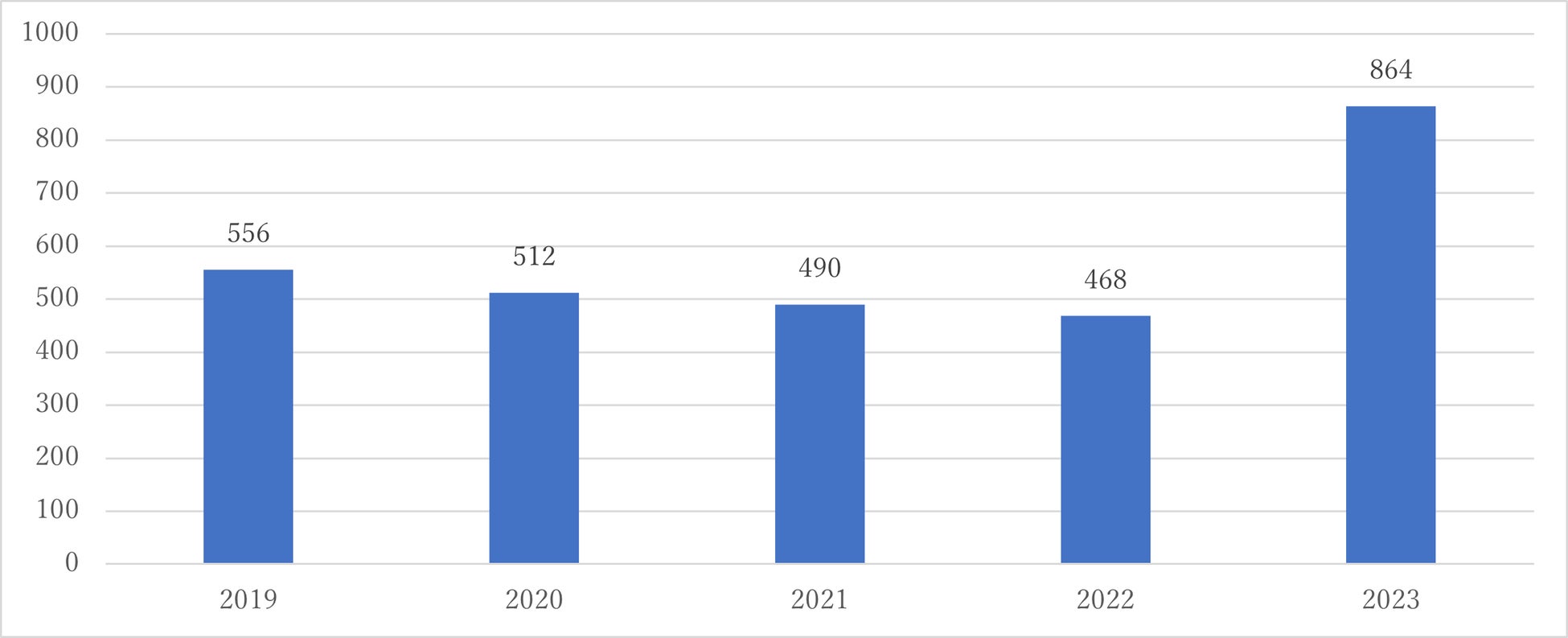 図1は2019年から2023年の「子育て支援」のワードを含む入札公告件数の推移です。2019年から2022年までに2,890件でした。推移としては2019年から2022年まで減少傾向にありましたが、2023年には864件と大幅に増加しました。