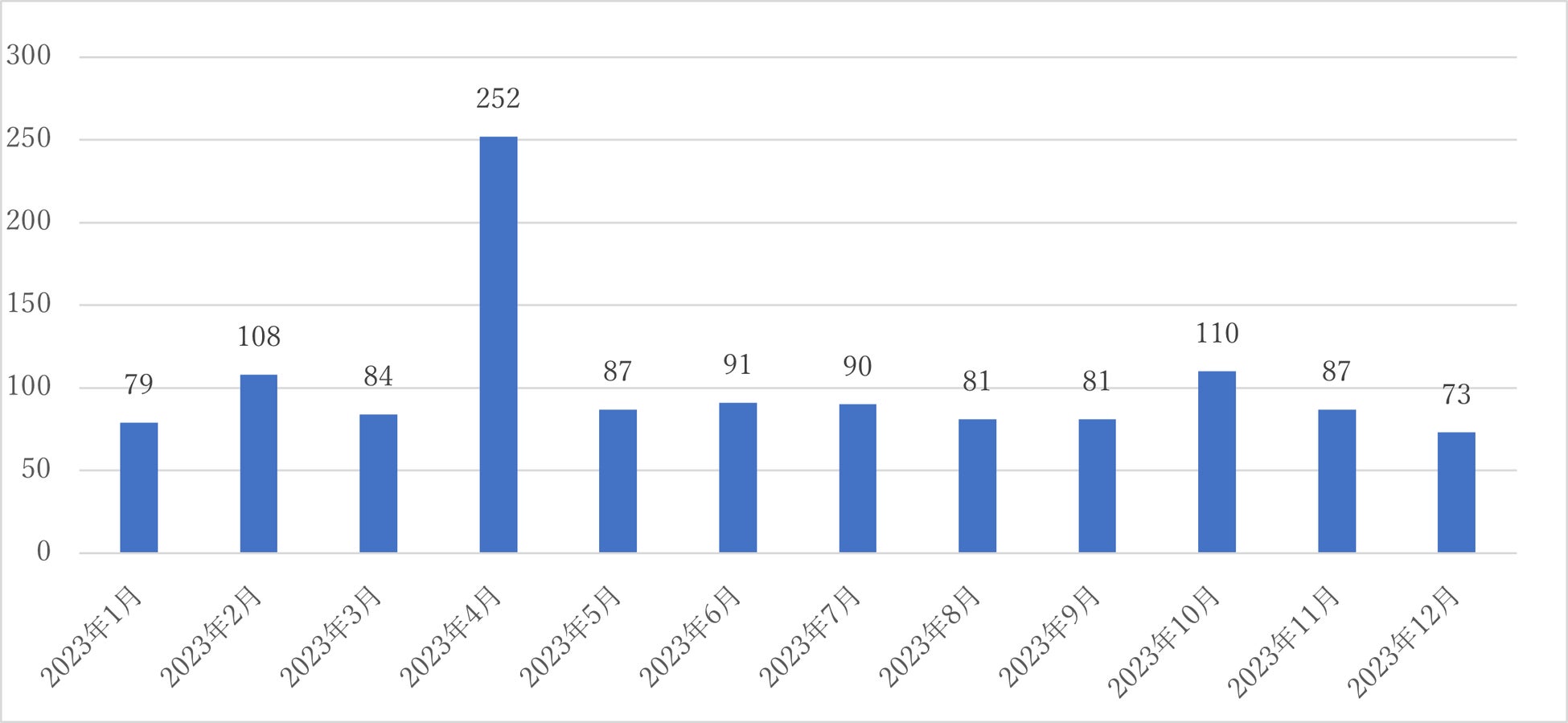 図11は2023年の月別落札件数の推移です。前述の例年の推移と同様に最多件数が4月の252件でした。その他の月別件数はそれほど差がなく、安定した件数となっています。