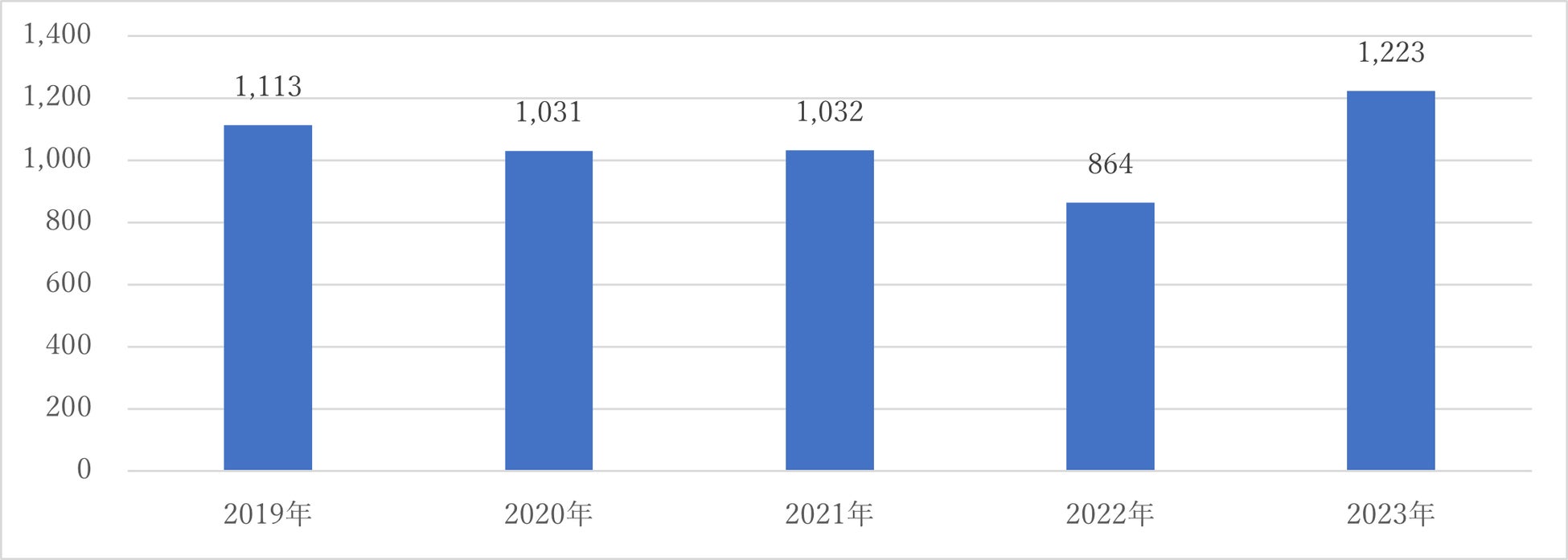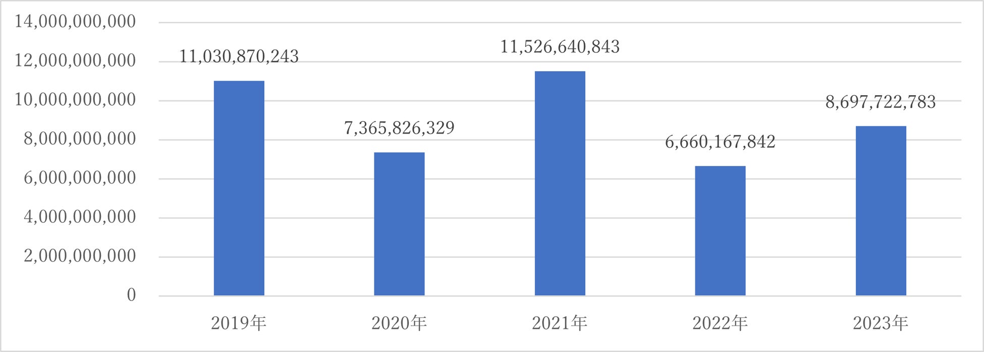 落札件数は2019年が最多の1,113件で、以降は減少傾向となり、2023年に1,223件と過去5年で最多件数に増加しました。落札金額は2022年が最低金額のおよそ66億6,017万円で、最高金額は2021年の115億2,664万 円で、2023年はおよそ86億9,772万円で、落札件数と落札金額の推移は異なる結果となりました。