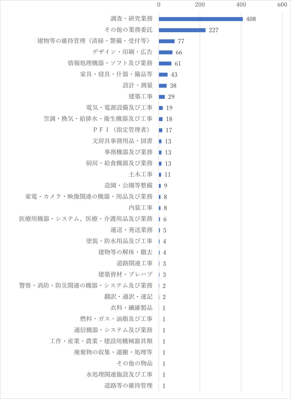 図6は2023年の「子育て支援」のワードを含む入札公告の業種カテゴリ別の内訳です。最多は「調査・研究業務」の408件、次いで「その他の業務委託」の227件、「建物等の維持管理(清掃・警備・受付等)」の77件が上位となりました。2020年から2022年までの結果と比較し「調査・研究業務」が著しく増加しました。この業種の具体的な公告としては「子ども・子育て支援事業計画策定業務委託」などが多く見られました。