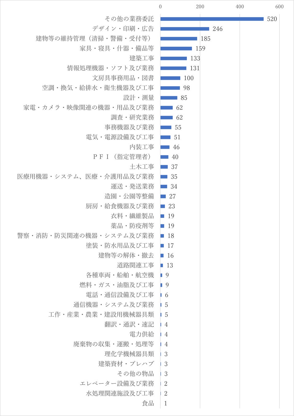 続いては2020年から2022年までの「子育て支援」のワードを含む入札公告の業種カテゴリ別の内訳です。最多は「その他の業務委託」の520件、次いで「デザイン・印刷・広告」の246件、「建物等の維持管理(清掃・警備・受付等)」の185件が上位となりました。