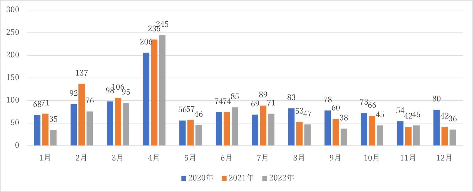 図9は2020年から2022年までの月別落札件数と同月比較の図表です。件数は各年すべてで4月が最多件数となっており、中でも2022年の4月が245件となりました。