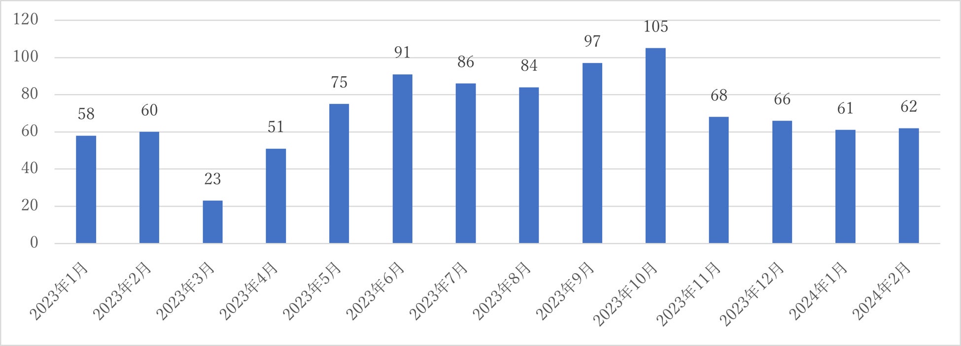 続いて、2023年の1月から12月までの「子育て支援」を含む入札公告件数の推移です。2023年の864件のうち、最多となった月は10月で105件でした。3月が大幅に少ないことを除き、過去3年とは異なった推移でした。2024年は現段階で昨年の同月と同程度の件数となっています。