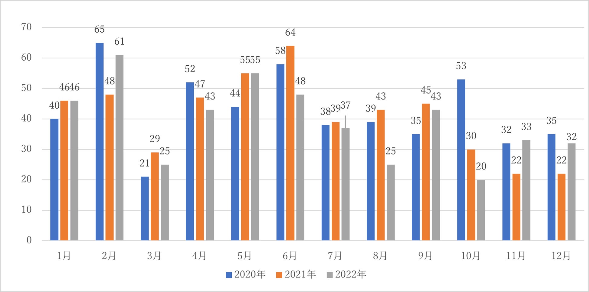 図2は2020年から2022年までの「子育て支援」を含む入札公告件数を同月で比較したグラフです。