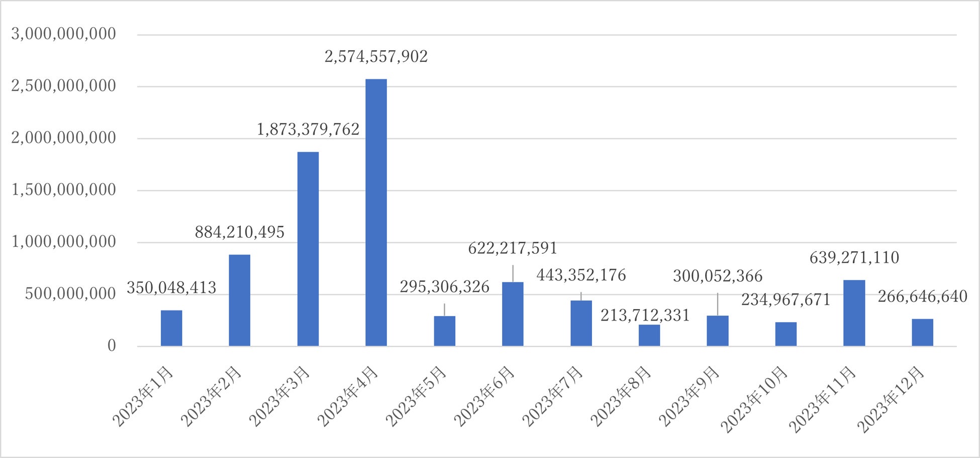 図12は2023年の月別落札金額の推移です。最高落札金額は、最多落札件数だった4月のおよそ25億7,456万円でした。2月から4月にかけての落札金額が多く、5月に著しく減額、12月までは低い金額となっており、2020年から2022年までの推移とも異なっていました。