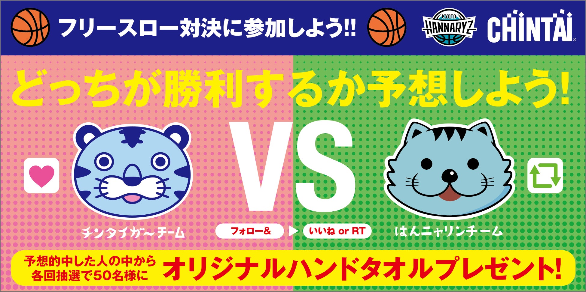 チンタイガーチーム VS はんニャリンチームのどちらが勝つかを予想して、見事的中した方の中から抽選で各回50名様にオリジナルハンドタオルをプレゼント