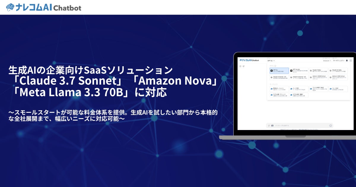 ナレコムAI Chatbot 最新の「Claude 3.7 Sonnet」、「Amazon Nova」、「Meta Llama 3.3 70B」に対応