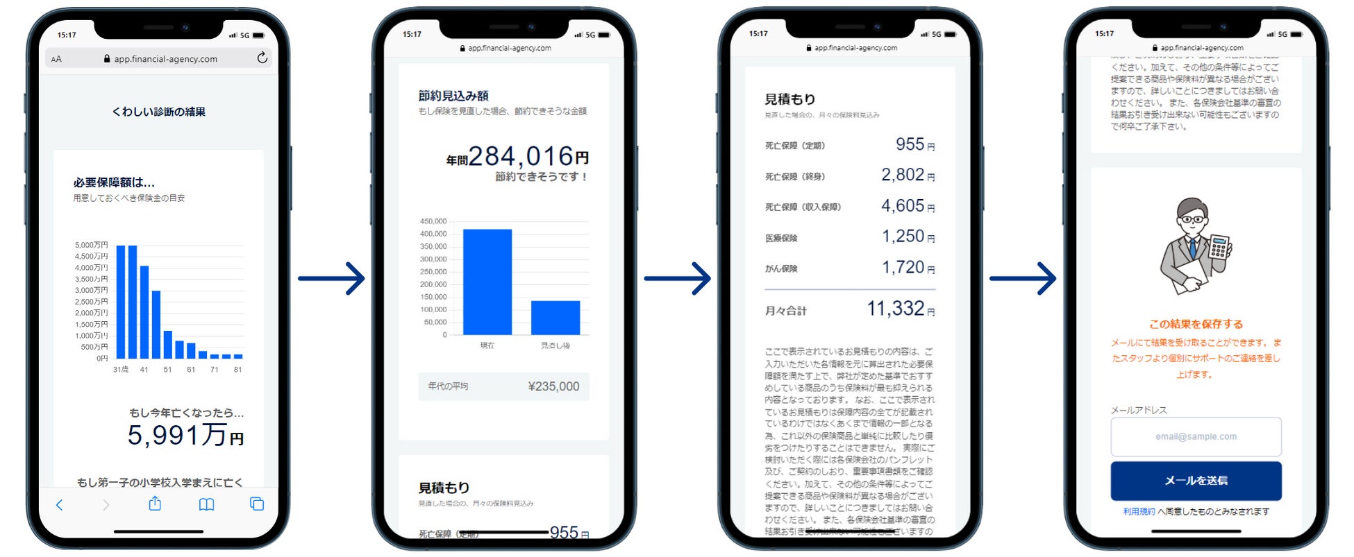 「保デジ」とは、無数にある保険商品の中から一人一人に最適なプランを提示することができる新しいAIコンサルティングサービスのWebアプリケーションです。お客様の年齢や性別、家族構成などをWeb上で入力すると、その内容をもとに算出された”必要保障額(=保険で準備しておくべき金額)”と、さらにFAが取り扱っている保険会社全50社以上、合計3,500プラン以上の中から、その“必要保障額”を満たせる最も保険料が抑えられた商品を導き出します。わからない点や詳細を知りたい点がある場合は、そのままプロのファイナンシャルプランナー(FP)にメールや電話、またはWeb面談などで無料相談をすることができます。