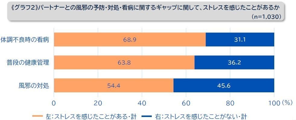 今回の調査では、「仕事」「住まい」と並んで、パートナーとの「普段の健康管理」に関する意識の違い自体をストレスと感じている人が2割存在することが明らかになりました。そして、その半数以上の人が、風邪の予防・対処・看病に関する“パートナー間ギャップ”をストレスに感じていることから、普段からお互いの考え方について話し合い、ギャップを埋めることを心掛けましょう。
