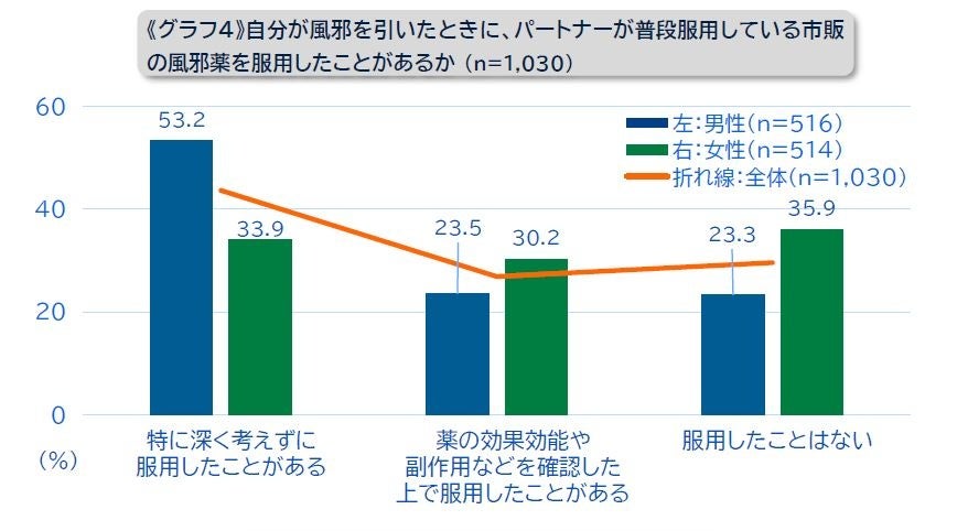 男性の半数以上は、深く考えずにパートナーの風邪薬を服用した経験あり。 「パートナーの風邪薬」は、効能・効果や副作用を確認せずに服用されやすい実態が明らかに