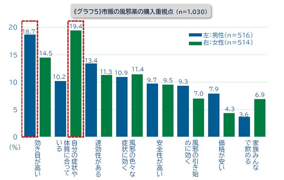 全体の約4割が「特に深く考えずに服用したことがある」と回答。男女別で見ると男性53.2%、女性33.9%と、男性の方が服用する傾向が高いことが分かりました《グラフ4》。さらに、市販薬購入時の重視点を聞いたところ、男性は「効き目が高い」(18.7%)、女性は「自分の症状や体質に合っている」(19.4%)と、購入時の意識の違いも明らかになりました《グラフ5》。