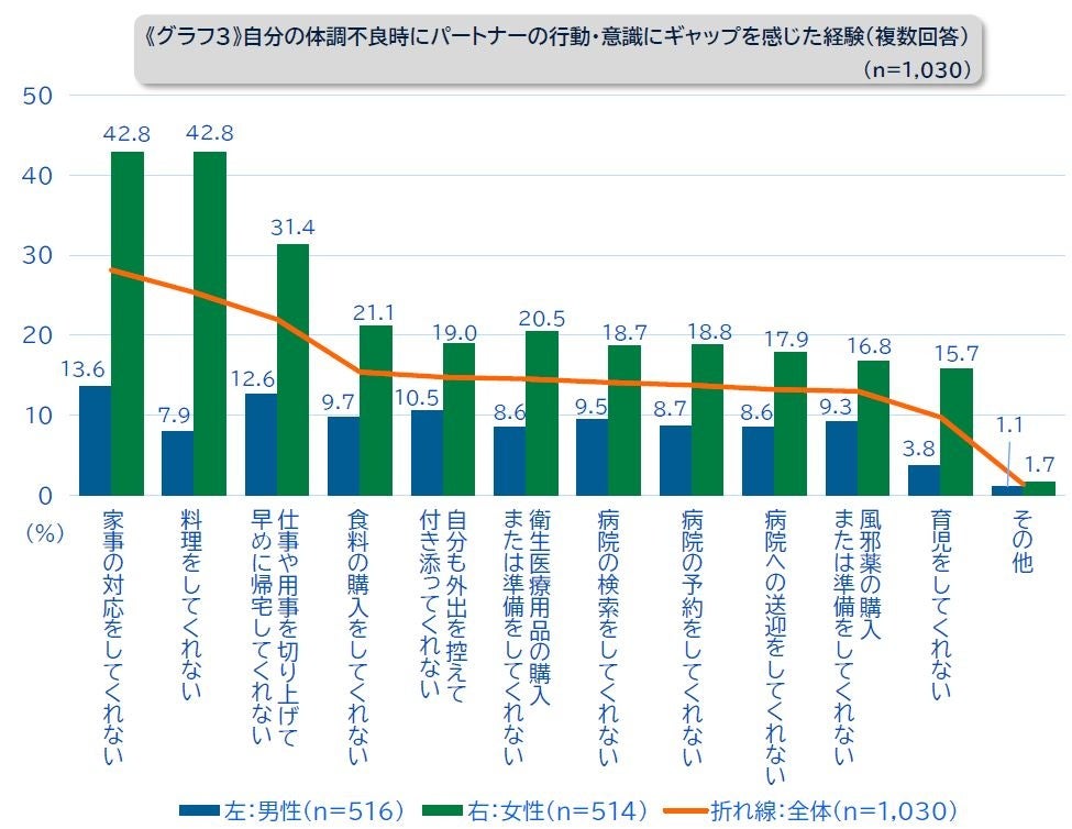 自分の体調不良時における、相手の行動・意識に対するギャップを聞いたところ、「家事(掃除・洗濯など)をしてくれない」(28.1%)と「料理をしてくれない」(25.3%)、「仕事や用事を切り上げて早めに帰宅してくれない」(22.0%)ことにギャップを感じていることも分かりました《グラフ3》。