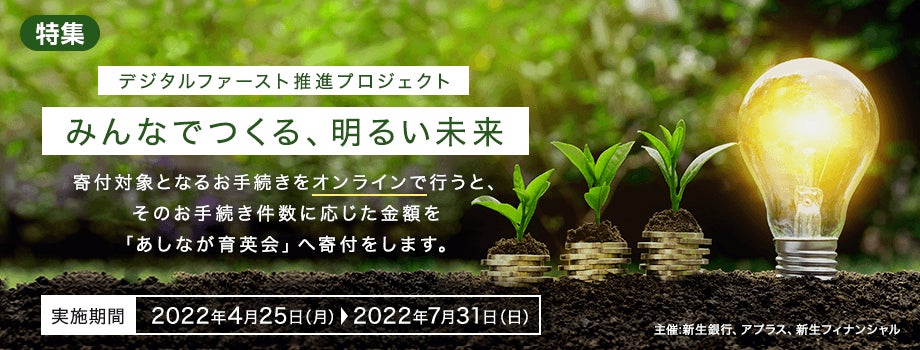 新生銀行グループの株式会社新生銀行、株式会社アプラス、および新生フィナンシャル株式会社の3社は、このたび、お客さまのオンラインを通じた各種お手続きについて、その件数に応じて寄付を行う「デジタルファースト推進プロジェクト」を、2022年4月25日から2022年7月31日までの期間、実施いたします。