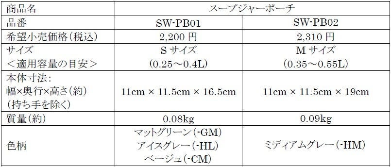 | スープジャーポーチ | SW-PB01 | 2,200円 | 2022年9月1日 |