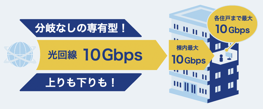 つなぐネットは、2018年4月よりマンションの共用部通信機器まで最大10Gbpsの光回線を使用したサービス「マンション全戸一括 10Gbpsタイプ※4」を提供していますが、この度つなぐネットがリリースする新サービスでは、マンションの各住戸まで、上り下りともに最大10 Gbpsでの提供を実現します。